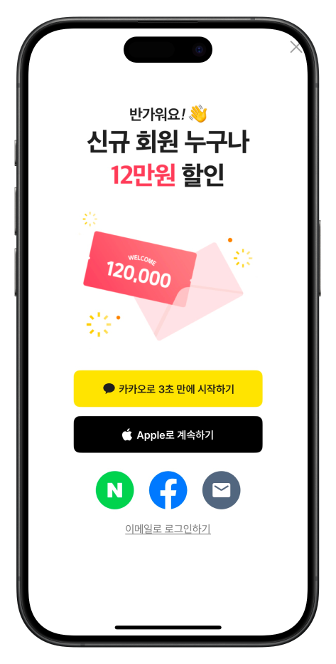 에이블리의 회원가입 화면은 "신규 회원 누구나 12만원 할인"이라는 파격적인 혜택과 "카카오로 3초 만에 시작하기"라는 간편함을 전면에 내세웁니다. 다양한 회원가입 옵션을 제공하여 사용자의 편의성은 극대화하고, 왜 가입하면 좋은지에 대해 파격적인 혜택을 보여주면서 회원가입이라는 허들을 낮추었습니다.