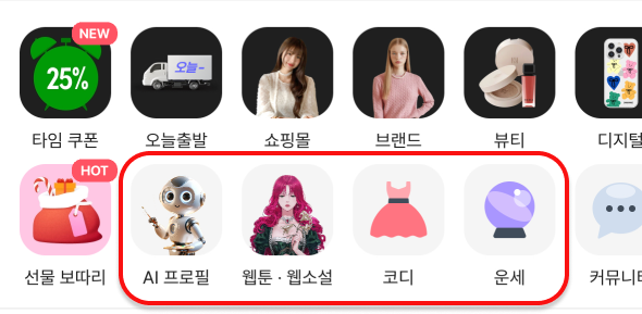 운세 보기, AI 프로필, 웹툰, 웹소설, 코디 추천…